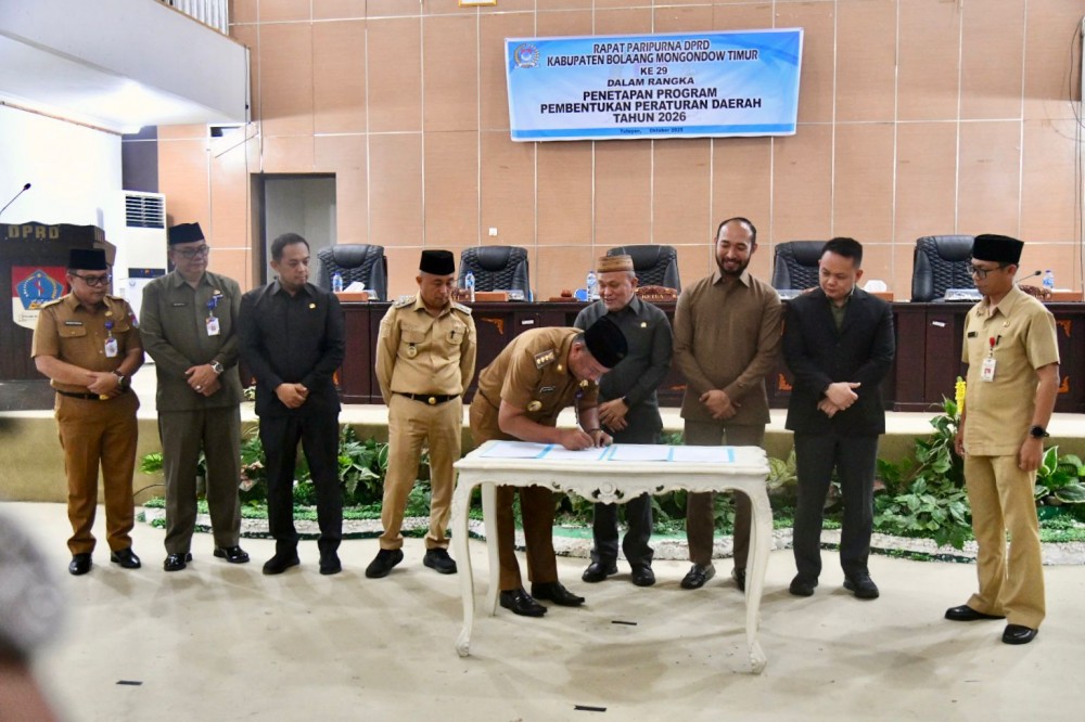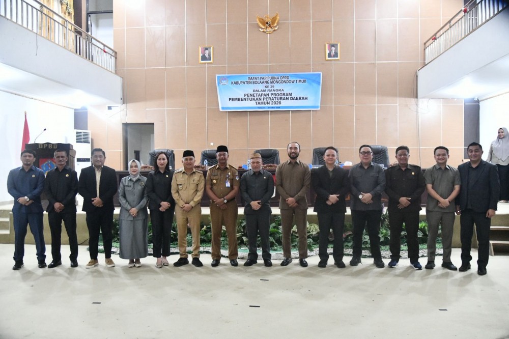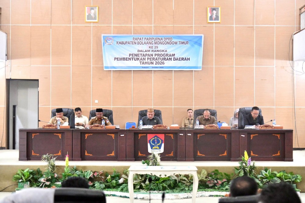 Bupati Bolaang Mongondow Timur (Boltim) Oskar Manoppo, didampingi Wakil Bupati Argo V. Sumaiku, menghadiri Rapat Paripurna DPRD dalam rangka penetapan Program Pembentukan Peraturan Daerah (Propemperda) Tahun 2026. Kegiatan tersebut berlangsung di Ruang Sidang Paripurna DPRD Boltim, Senin (27/10/2025).