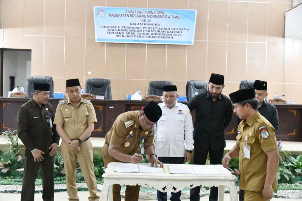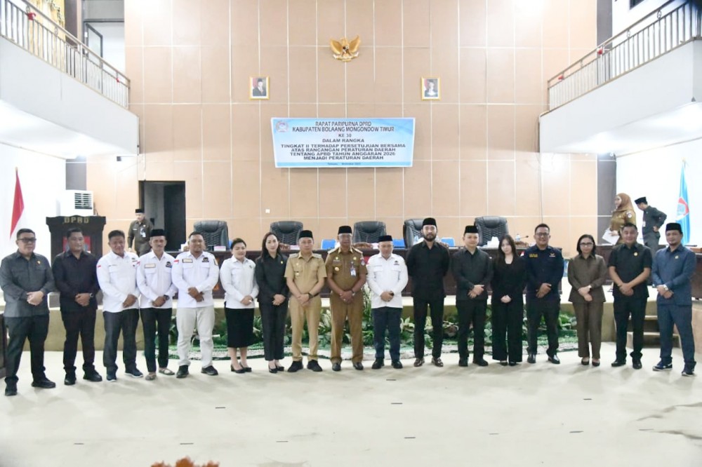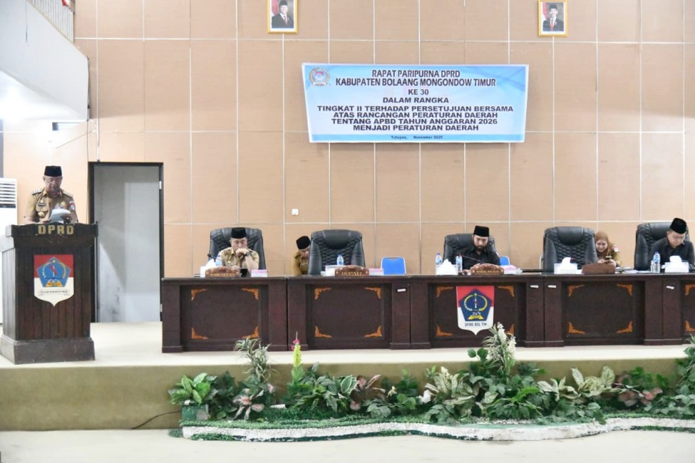 Bupati Bolaang Mongondow Timur (Boltim), Oskar Manoppo, didampingi Wakil Bupati, Argo V. Sumaiku, menghadiri Rapat Paripurna Tingkat II dalam rangka Persetujuan Bersama atas Rancangan Peraturan Daerah tentang Anggaran Pendapatan dan Belanja Daerah (APBD) Tahun Anggaran 2026 menjadi Peraturan Daerah.