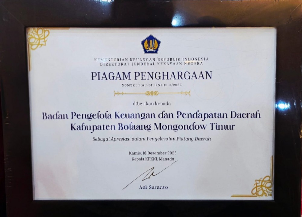 Pemerintah Kabupaten Bolaang Mongondow Timur (Boltim) melalui Badan Pengelola Keuangan dan Pendapatan Daerah (BPKPD) kembali menorehkan prestasi dengan meraih Piagam Penghargaan atas keberhasilan menyelesaikan piutang daerah pada ajang KPKNL Awards 2025. Penyerahan penghargaan tersebut dilaksanakan di Kantor KPKNL Manado, Kamis (18/12/2025).