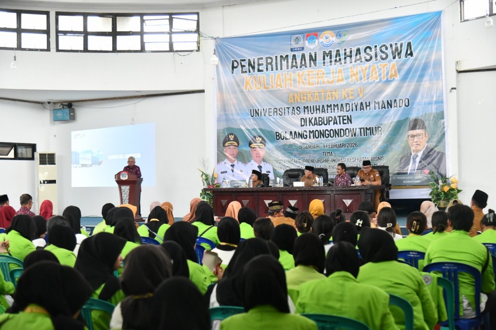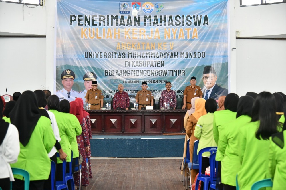 Mewakili Bupati Bolaang Mongondow Timur (Boltim), Oskar Manoppo, Sekretaris Daerah M. Iksan Pangalima secara resmi menerima Mahasiswa Kuliah Kerja Nyata (KKN) Angkatan Ke-V Universitas Muhammadiyah Manado yang akan melaksanakan pengabdian di Kabupaten Bolaang Mongondow Timur. Kegiatan penerimaan tersebut berlangsung di Aula Kantor Bupati Boltim, Senin (19/1/2026).