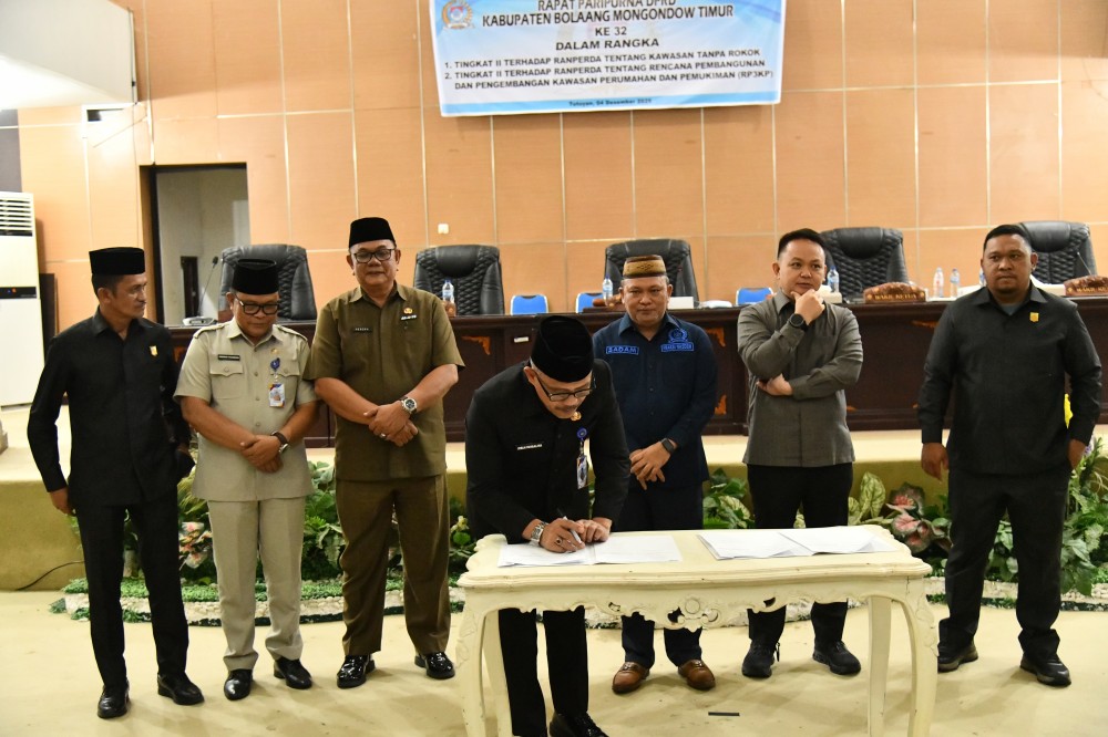 Usai penyampaian sambutan tersebut, DPRD bersama Pemerintah Kabupaten Bolaang Mongondow Timur resmi menetapkan kedua ranperda tersebut menjadi Peraturan Daerah (Perda), yakni Perda tentang Kawasan Tanpa Rokok (KTR) dan Perda tentang Rencana Pembangunan dan Pengembangan Perumahan dan Kawasan Permukiman (RP3KP).