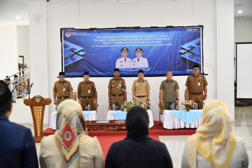 Bupati Bolaang Mongondow Timur (Boltim) Oskar Manoppo, didampingi Wakil Bupati Argo V. Sumaiku, melantik sekaligus mengambil sumpah/janji Pejabat Administrator dan Pejabat Pengawas, serta menunjuk Pelaksana Tugas di lingkungan Pemerintah Kabupaten Bolaang Mongondow Timur. Kegiatan tersebut berlangsung di Kantor Bupati pada Senin (3/11/2025).