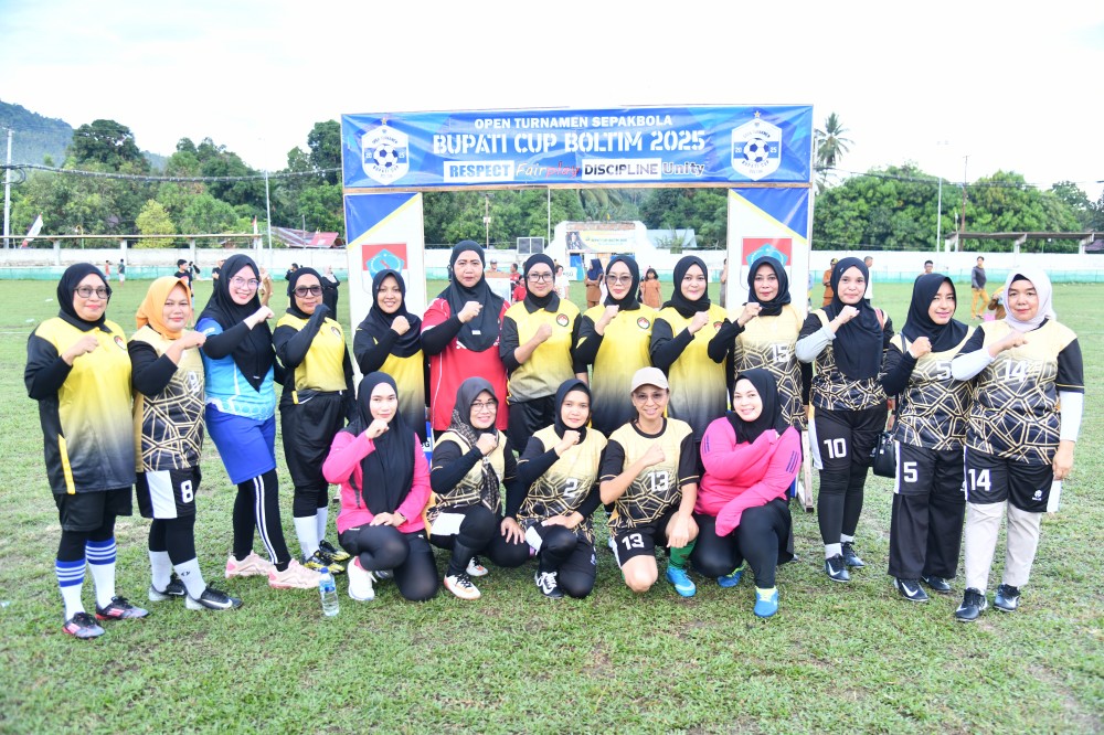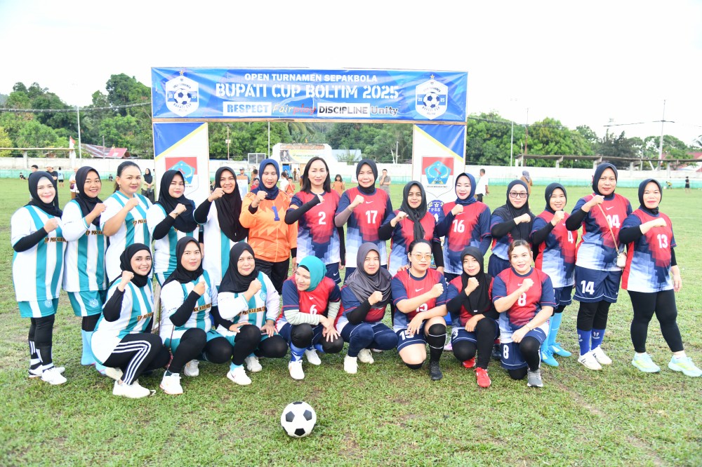 Mewakili Ketua TP-PKK, Sekretaris TP-PKK Boltim, Ny. Lucia Kristina Mokoginta, dipercaya sebagai kapten tim dalam pertandingan ini. Di bawah kepemimpinannya, skuad TP-PKK tampil penuh energi, kompak, dan menghibur. Meski hanya bertajuk ekshibisi, pertandingan berlangsung meriah, hangat, dan sarat keakraban antara kedua organisasi.